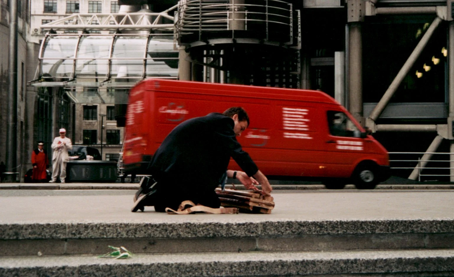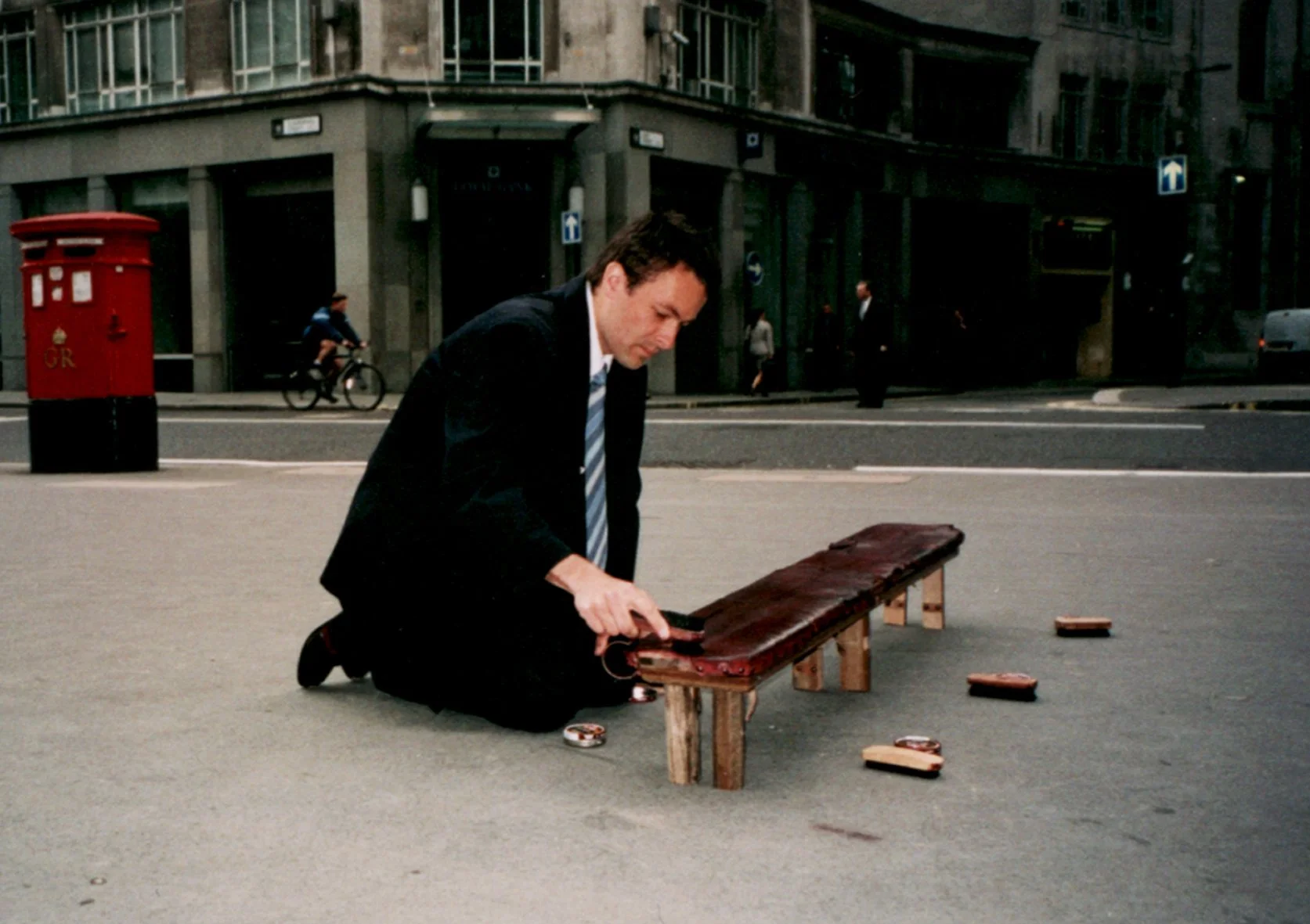 Staged over two weeks in London’s financial district, Nugget Kneeler took place daily on the pavement beneath the Lloyds Tower, opposite a 16th century church. A portable kneeler, built from recycled pews and folding into a briefcase, was carried into the city each morning. At the sound of the 9am church bell it was unfolded on the footpath, brushes and tins were laid out, and the leather surface was polished with Kiwi oxblood nugget until the bell tolled again at 5pm.